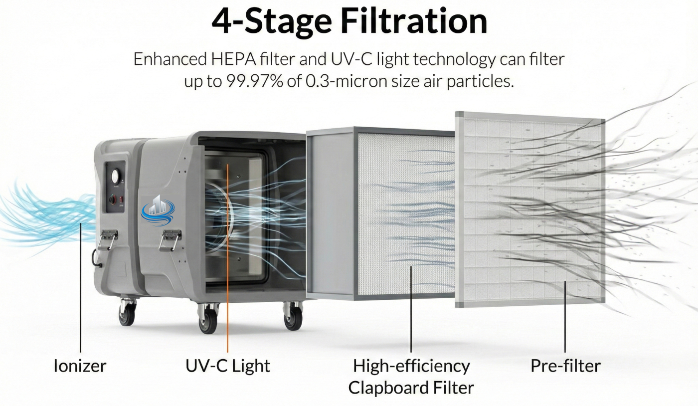 ASUVION-2000 negative air machine uses UV-C light and ion generator technology to clean the air of fine particles thoroughly. The device has HEPA and pre-filter to capture 99.97% of particles and create a healthy and comfortable indoor environment.